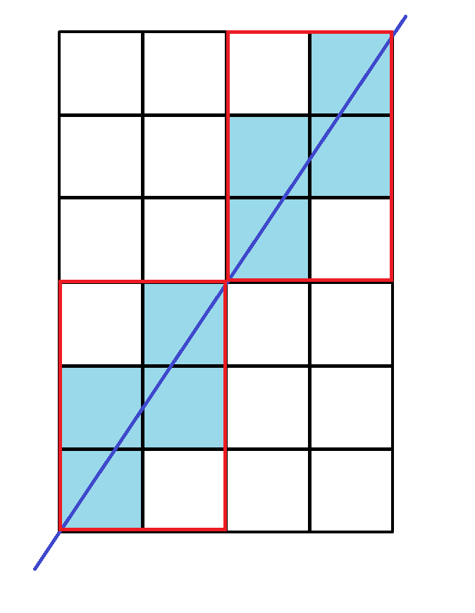 w=4, h = 8인 사각형은 최대공약수(2)의 수 만큼 나눠진다. (빨간사각형)