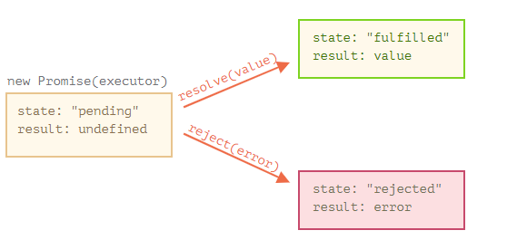 result - 처음에는 undefined 였다가 resolve(value)가 호출된다면 value로, reject(error)가 호출된다면 error로 변환됩니다.